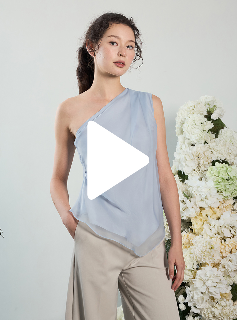 Product Details: Relaxed fit with slight cinch around waist | One-shoulder detail | Pleats around shoulder and waist | Sheer, light and airy fabric | Fully Lined | Comes in Sky Blue & Sunset
