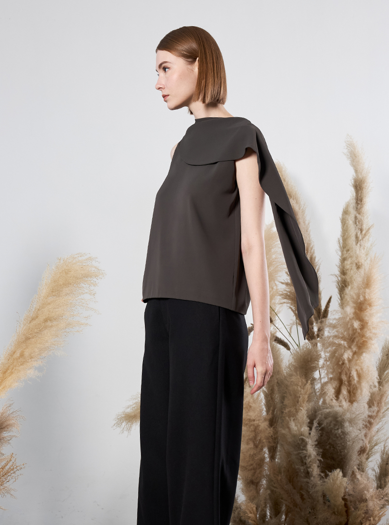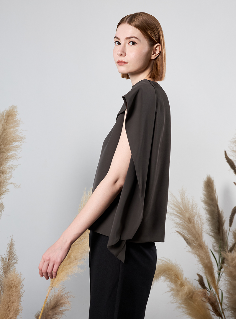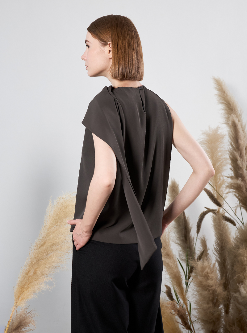 It features a relaxed fit, and has a beautiful draped sash around the neckline. The sash is secured at the shoulder, so you don’t have to worry about it falling off as you move around.