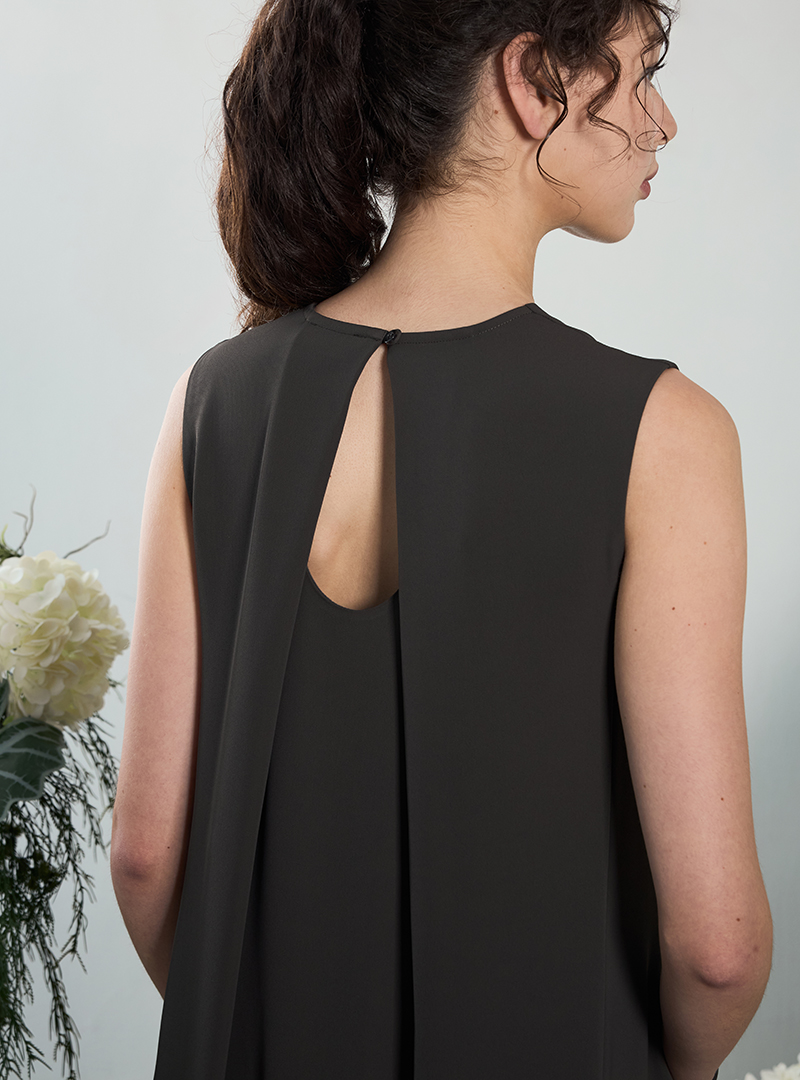 It has a tent-shaped silhouette and a round neckline. The back detail features this unique pleated design that adds interest to this number.